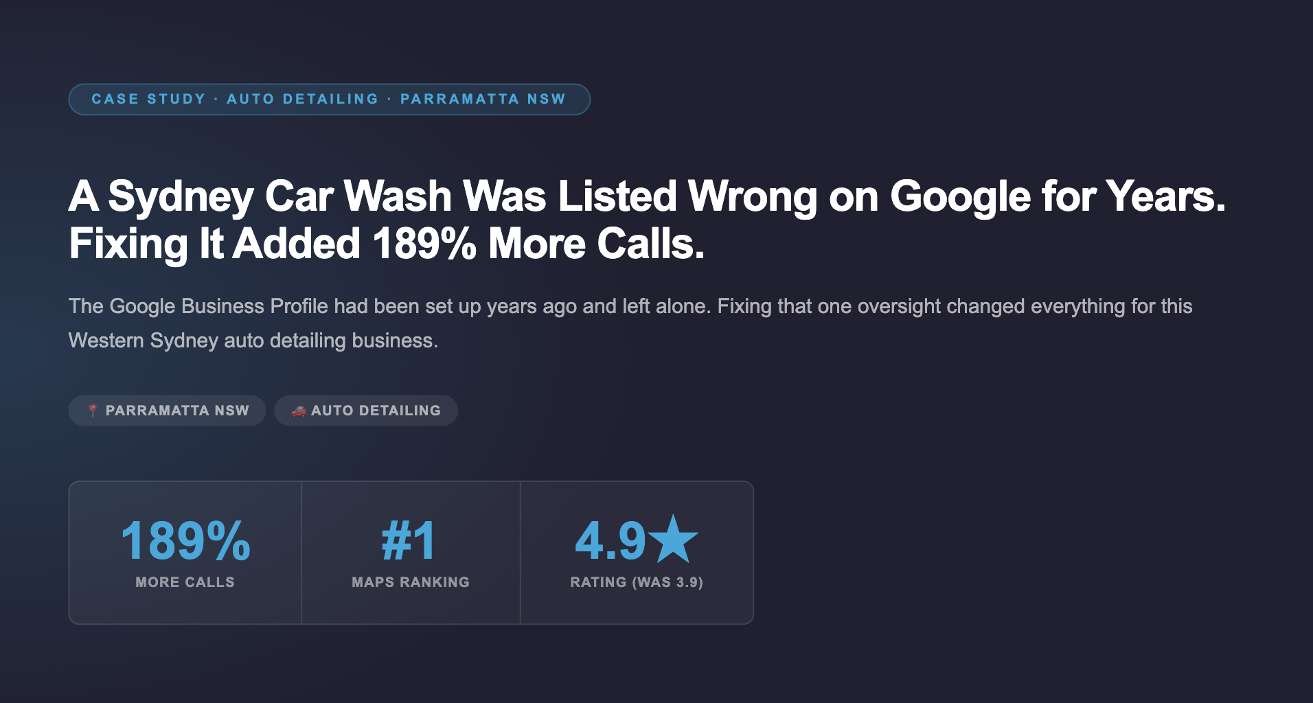 Thousands of Australian car washes have a Google Business Profile that was set up by someone years ago and has barely been touched since. Getting serious about it takes a few months of focused work. The 189% call increase you have just read about is what that work looks like in practice. The gap will not stay this wide forever.
